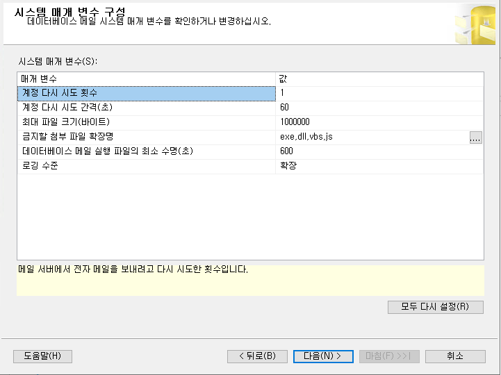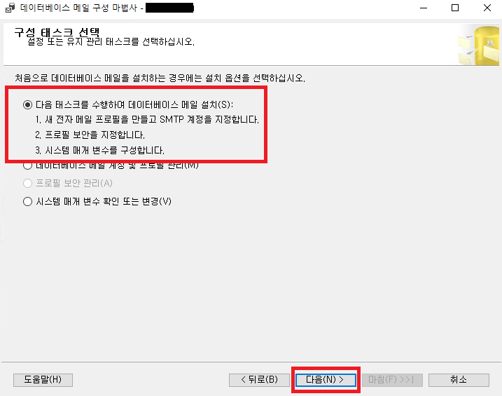 '다음 태스크를 수행하여 데이터베이스 메일 설치' 를 선택하고 다음을 누른다.