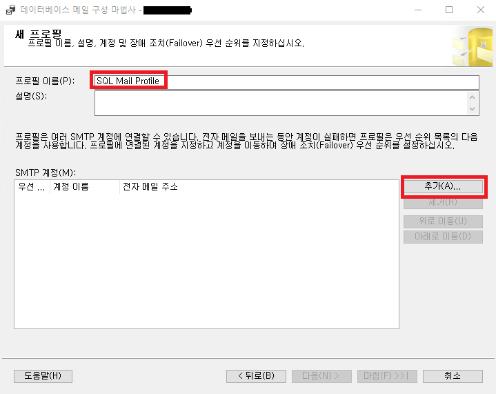 프로필 이름을 설정하고, '추가'를 눌러 SMTP계정을 입력하도록 한다.