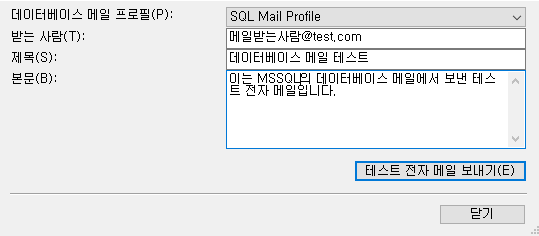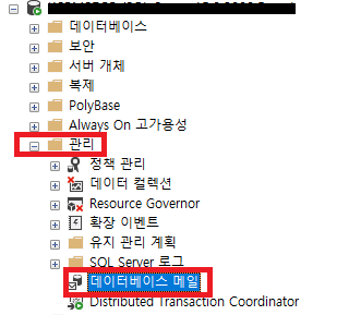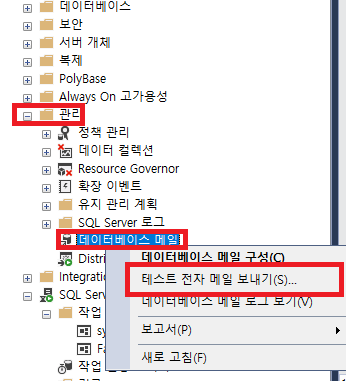 [관리 -> 데이터베이스 메일 (마우스 우클릭) -> 데이터베이스 메일(우클릭) -> 테스트 전자 메일 보내기] 를 누른다.