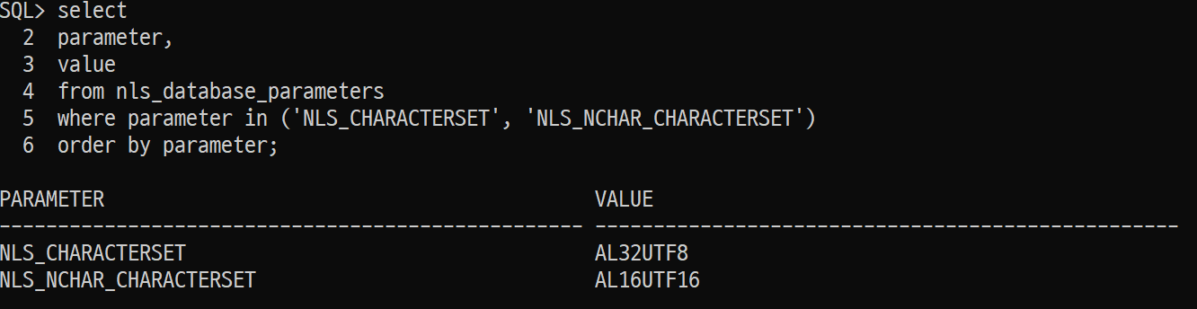 where parameter in ('NLS_CHARACTERSET', 'NLS_NCHAR_CHARACTERSET')