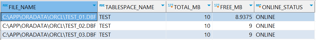 이렇게 위와 같이 'TEST'라는 테이블스페이스를 생성하고 10M 크기의 datafile을 3개 생성합니다.